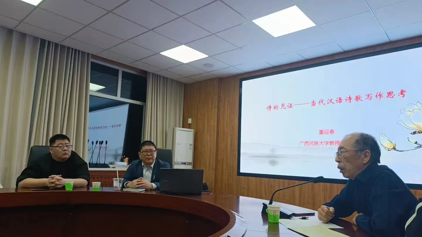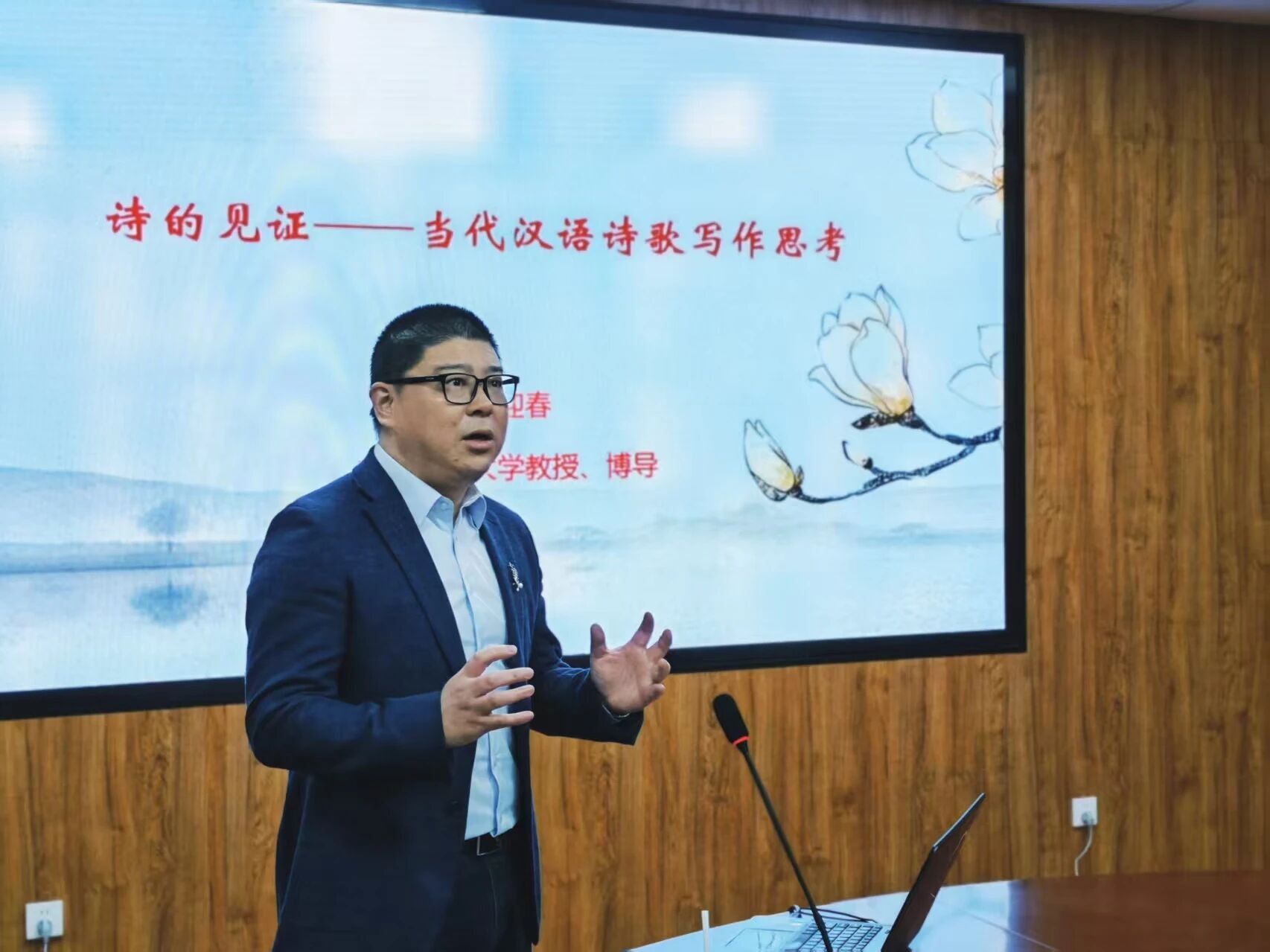 2025年11月16日,球友会在盛乐校区院系楼三楼文澜厅举办了一场题为《诗的见证——当代汉语诗歌写作思考》的学术讲座。讲座由广西民族大学球友会教授、博士生导师董迎春主讲,球友会张子程教授主持,70余名硕博士研究生、本科生共同聆听了此次讲座。